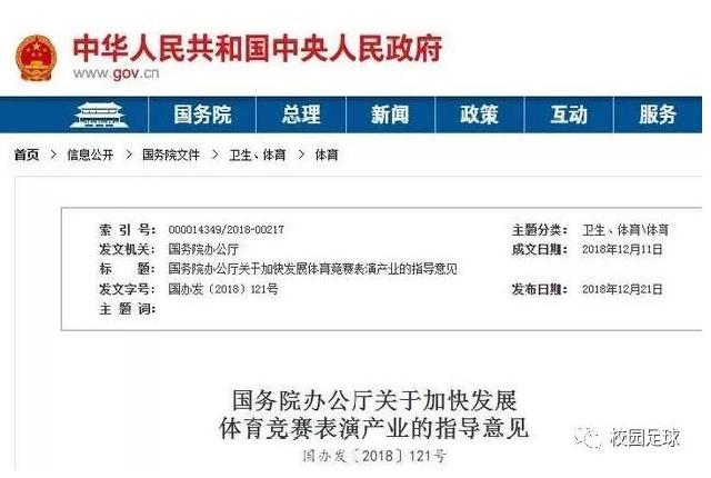 21日,中国国务院办公厅发布了《关于加快发展体育竞赛表演产业的指导意见》的文章,其中重点提出要大力发展职业赛事,其中会着重发展足球、篮球、排球、羽毛球、乒乓球、围棋及冰球等职业联赛。